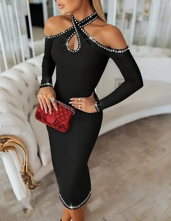 Elegant Long - Sleeve Cold - Shoulder Bodycon Dress, Rhinestone - Embellished Halter Neck Midi Dress for Party & Evening Wear
